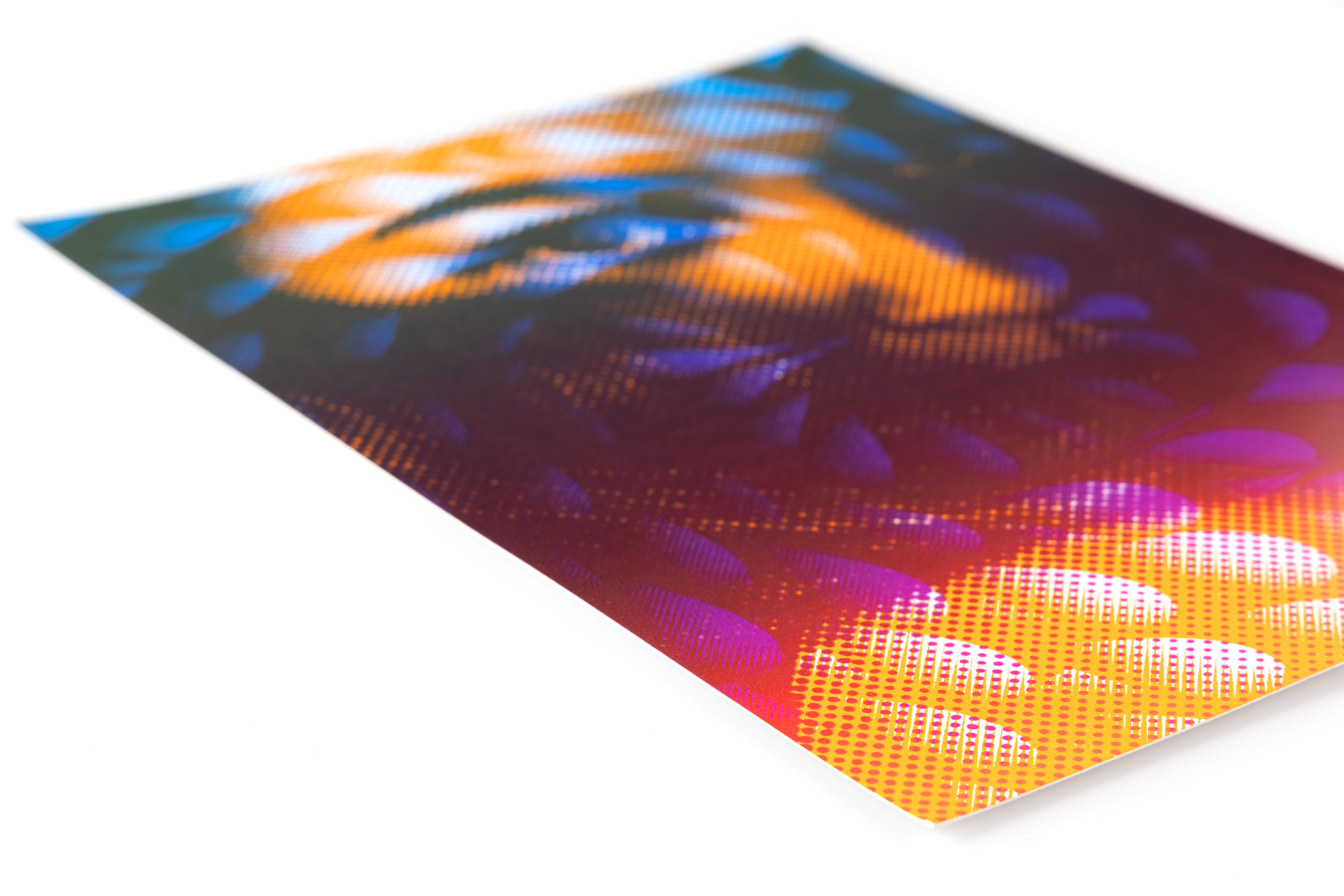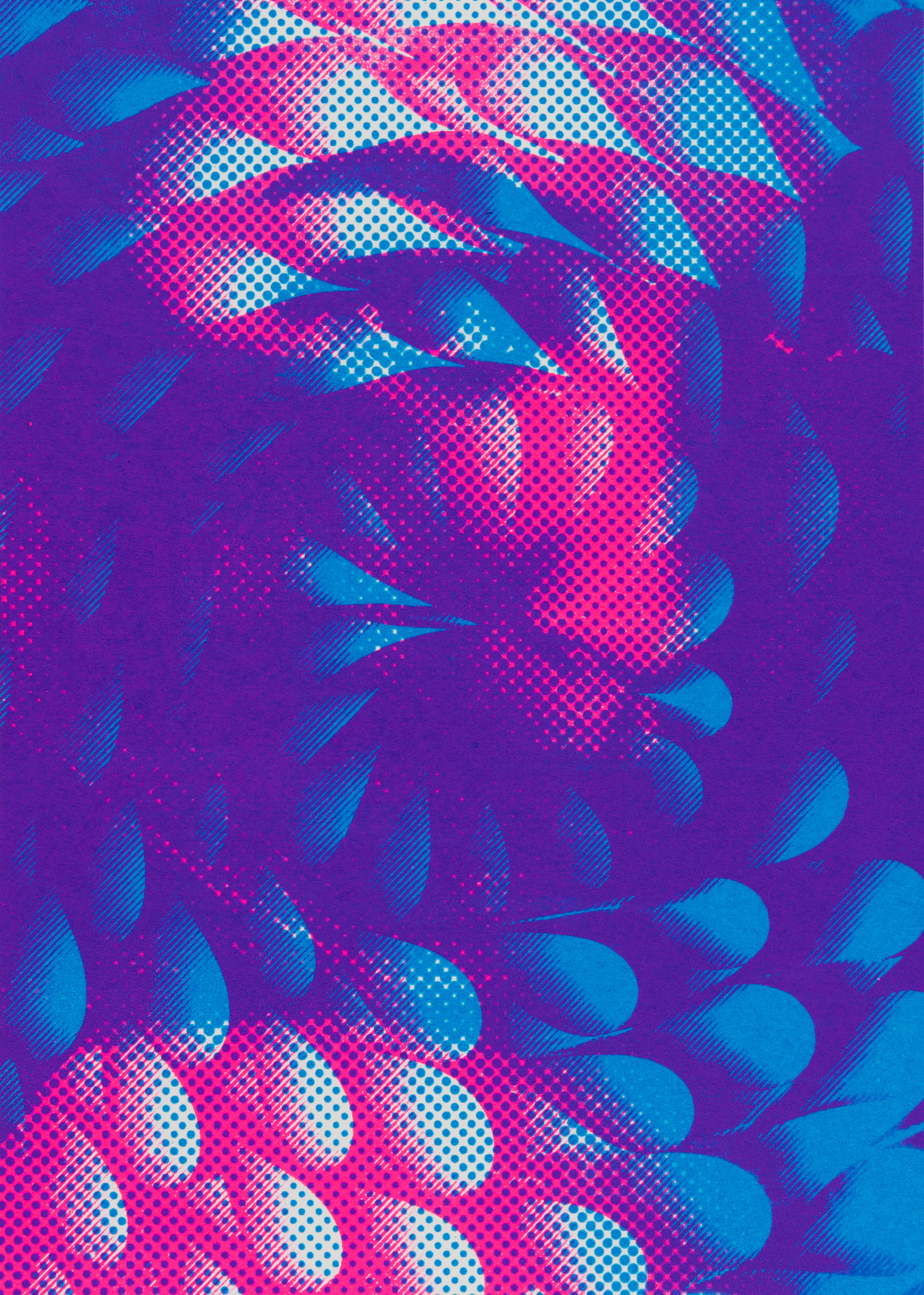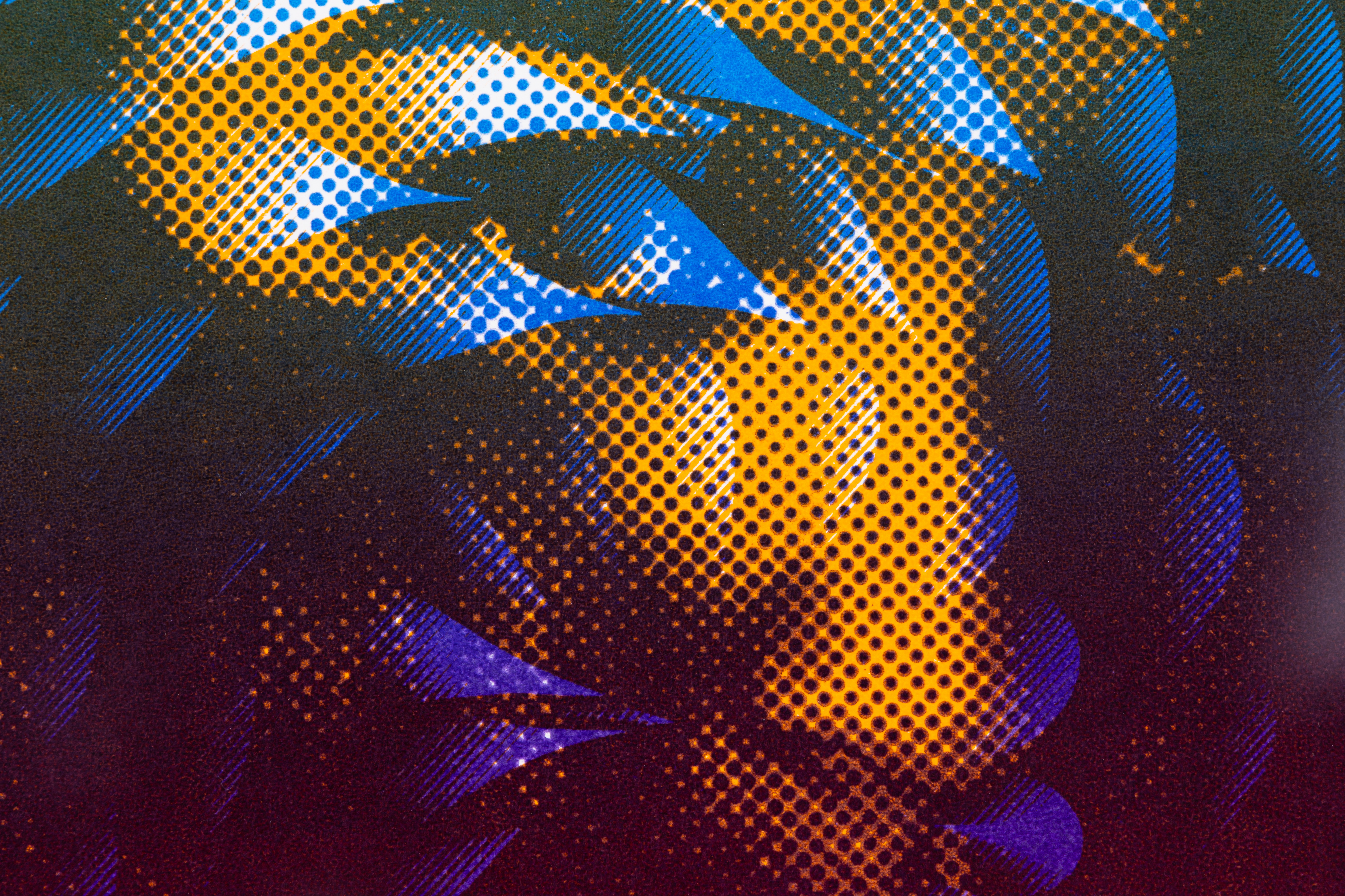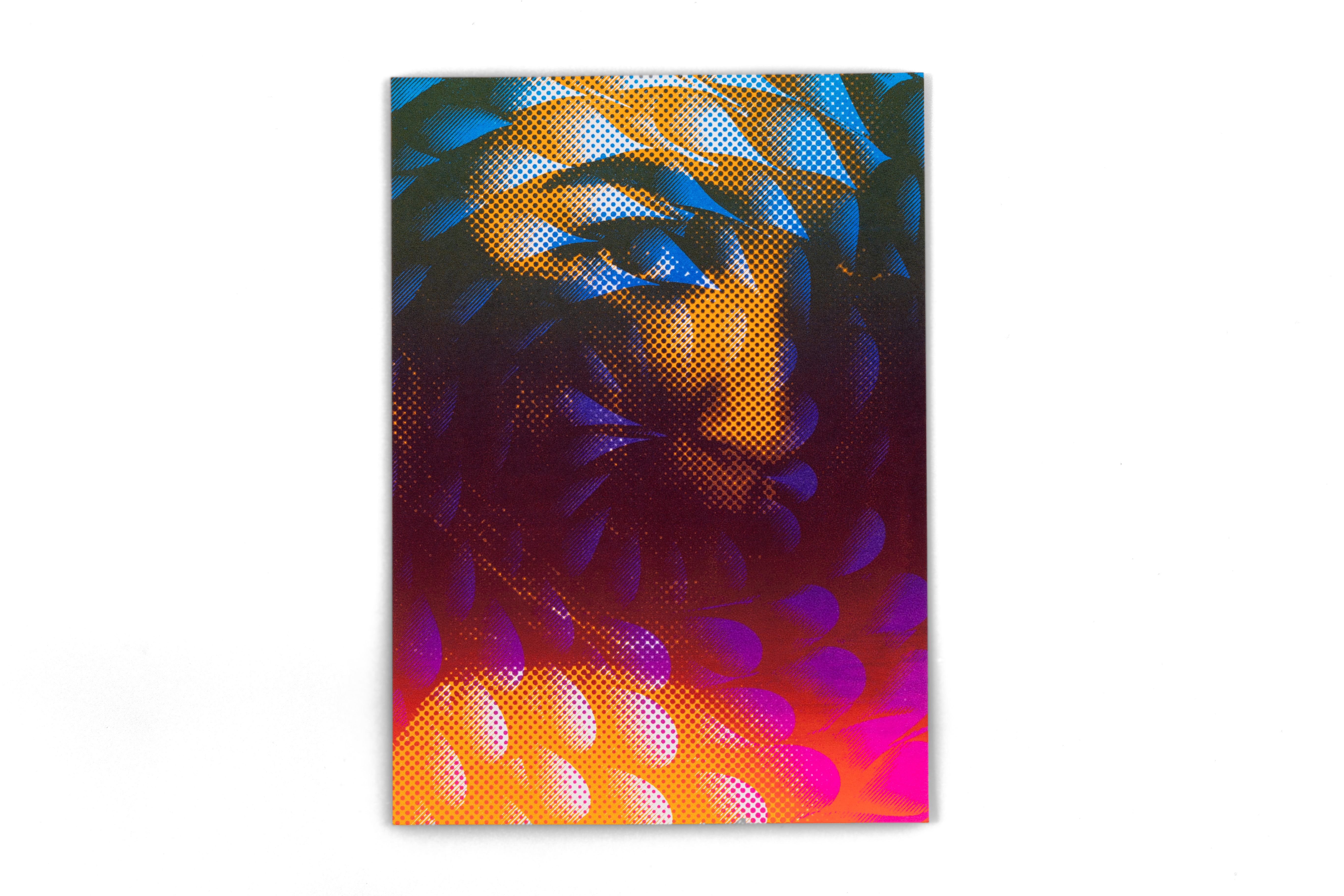 I worked in a team of two on the creative expression possibilities of screen and offset printing. With two self-selected pictures I printed postcards in A5 format. To distinguish the two pictures, I put them each in two different bitmap grids. I experimented with all kinds of colours and always came up with fascinating results. In the portfolio I limited myself to my personal favourite and presented it with repros.